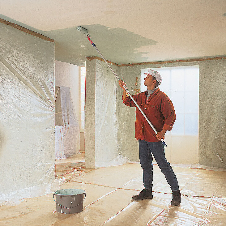 Malerrolle, Bohrmaschine, Rührquirl, Mörtelkübel, Glättkelle, Maurerkelle, Schwammbrett, Klebeband, Folie