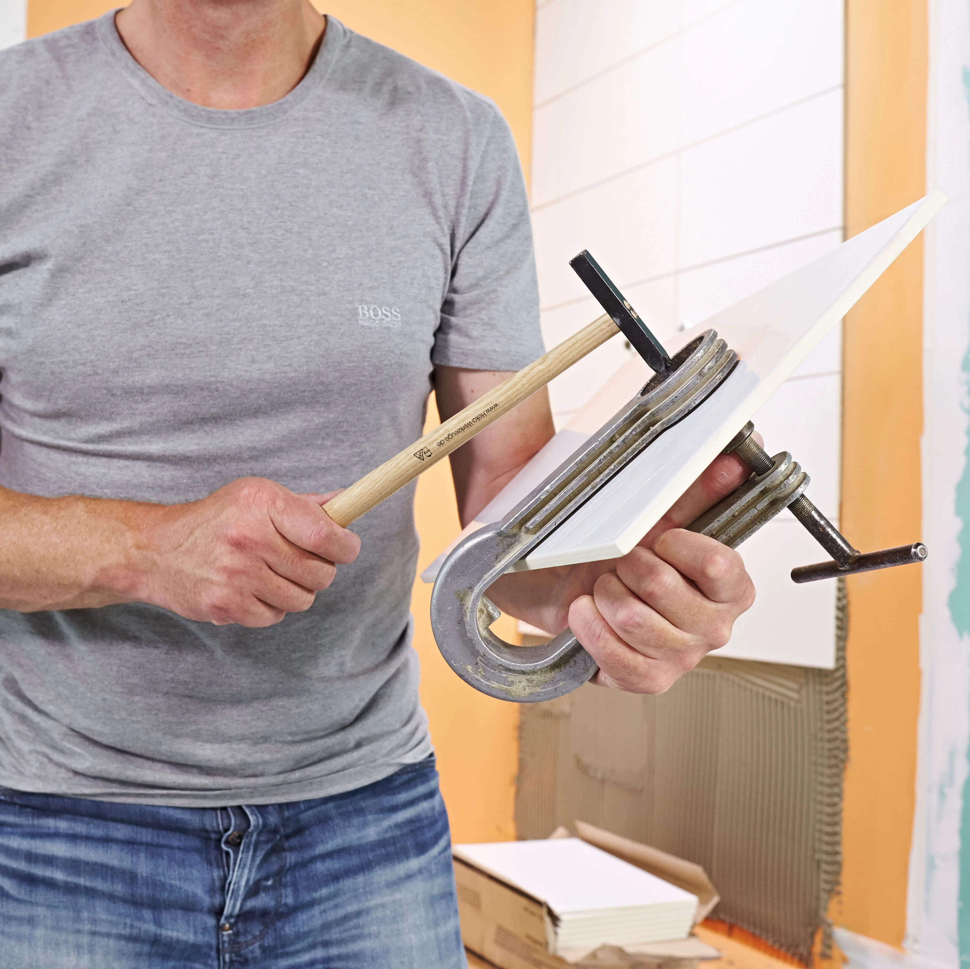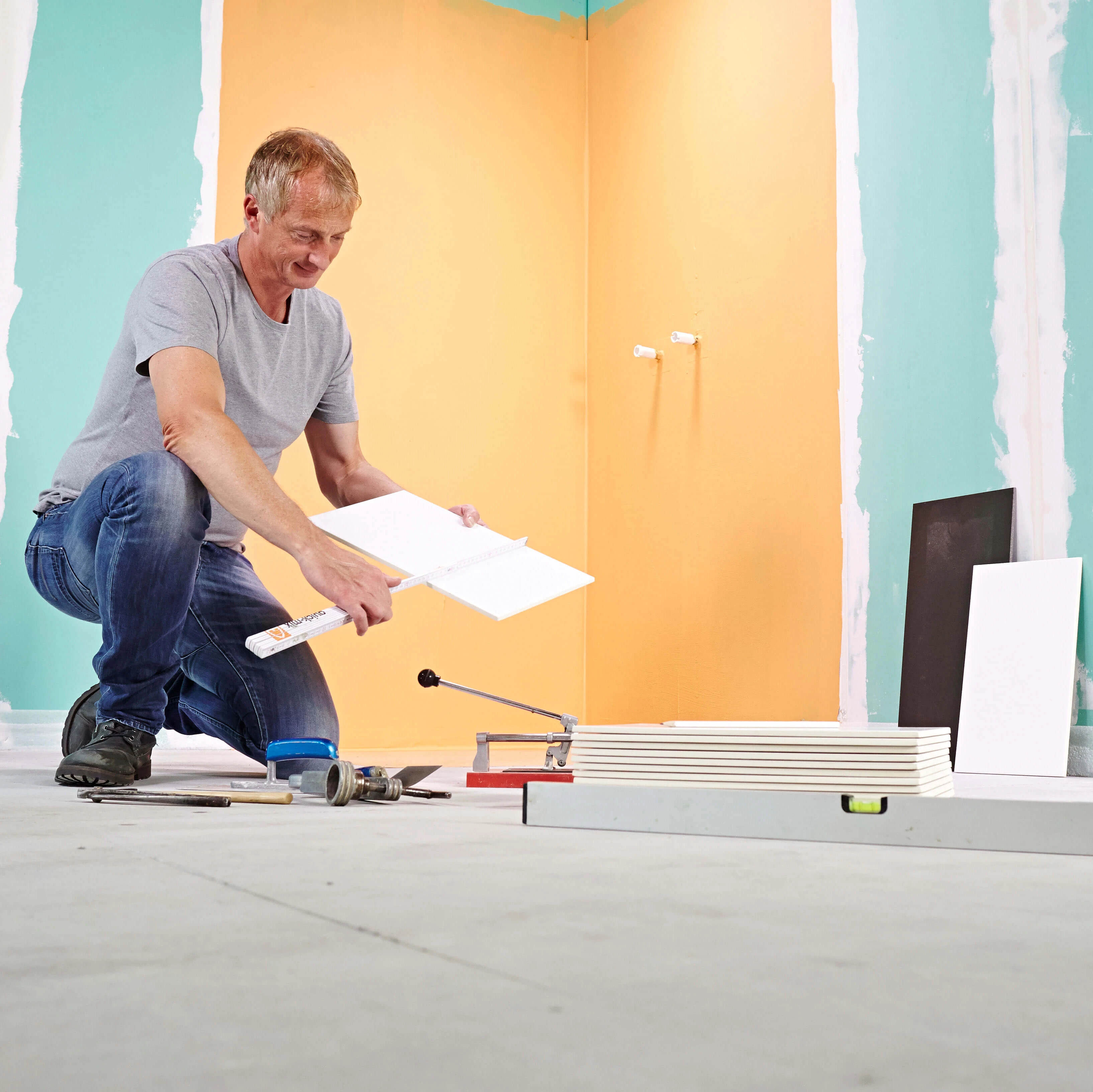 Wenn ihr in einem Raum die Wände und den Boden fliesen wollt, beginnt ihr mit den Wänden. Tretet regelmäßig ein paar Schritte zurück, um die Wand als Ganzes betrachten zu können. Nehmt immer nur eine Fliese in die Hand und prüft nach dem Ankleben mit der Wasserwaage, ob sie waagerecht ist. Ihr könnt frisch geklebte Fliesen noch etwa 10 Minuten lang verschieben! Für jedes Projekt gibt es einen passenden Fliesenkleber. Welchen ihr am besten nehmen sollten, erfahrt ihr in unserem Handbuch, das ihr unten kostenlos downloaden könnt.