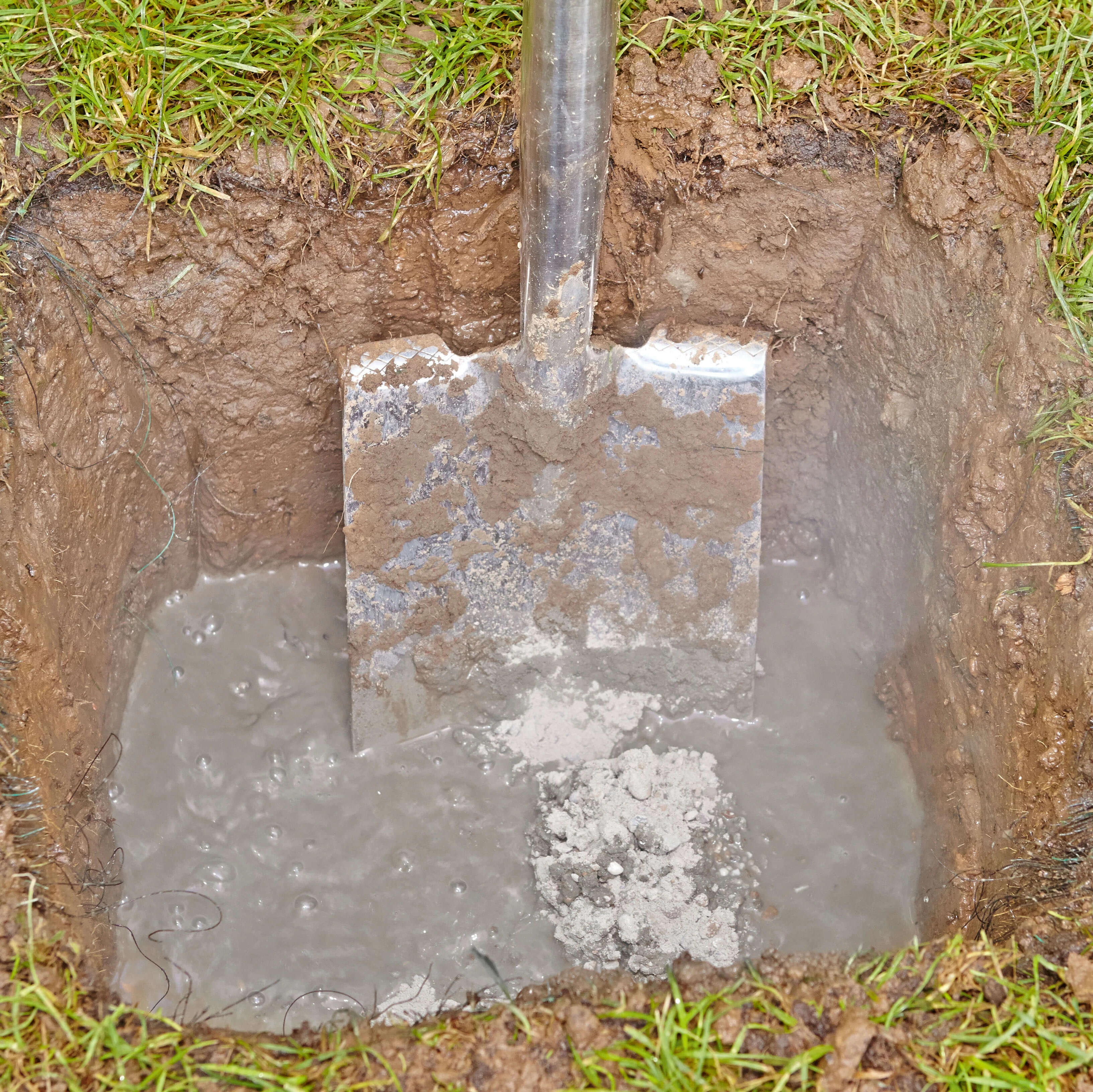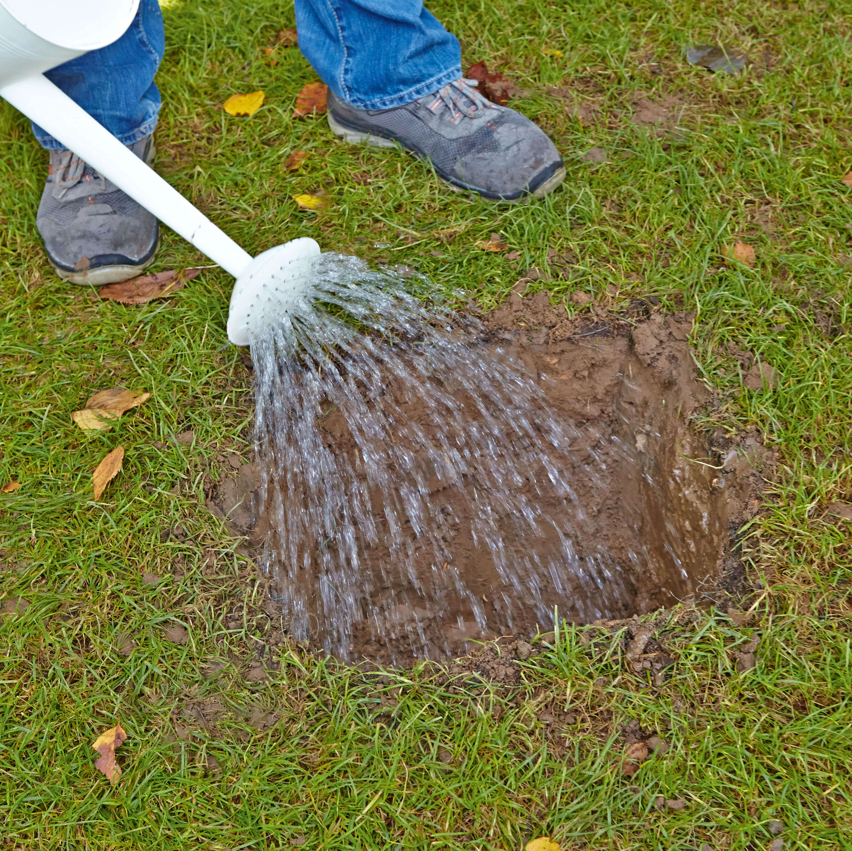 Hinweis: Die Wasserzugabemenge für einen 25-kg-Sack Ruck-Zuck Beton beträgt 3 bis 3,5 Liter. Den Ruck-Zuck Beton in Lagen von jeweils ca. 10 bis 15 cm einbringen und jede Lage vollständig mit Wasser aus einer Gießkanne begießen.