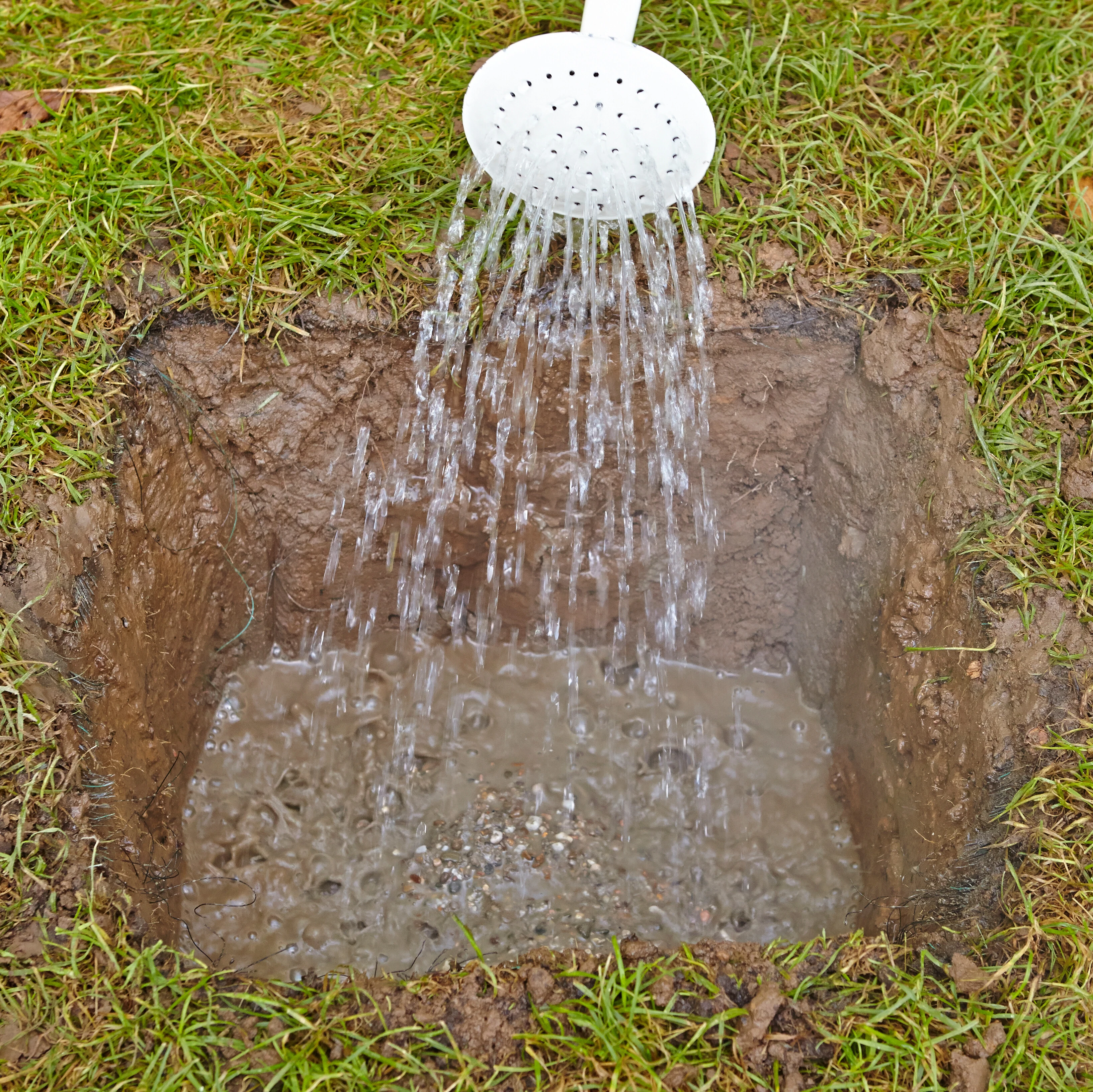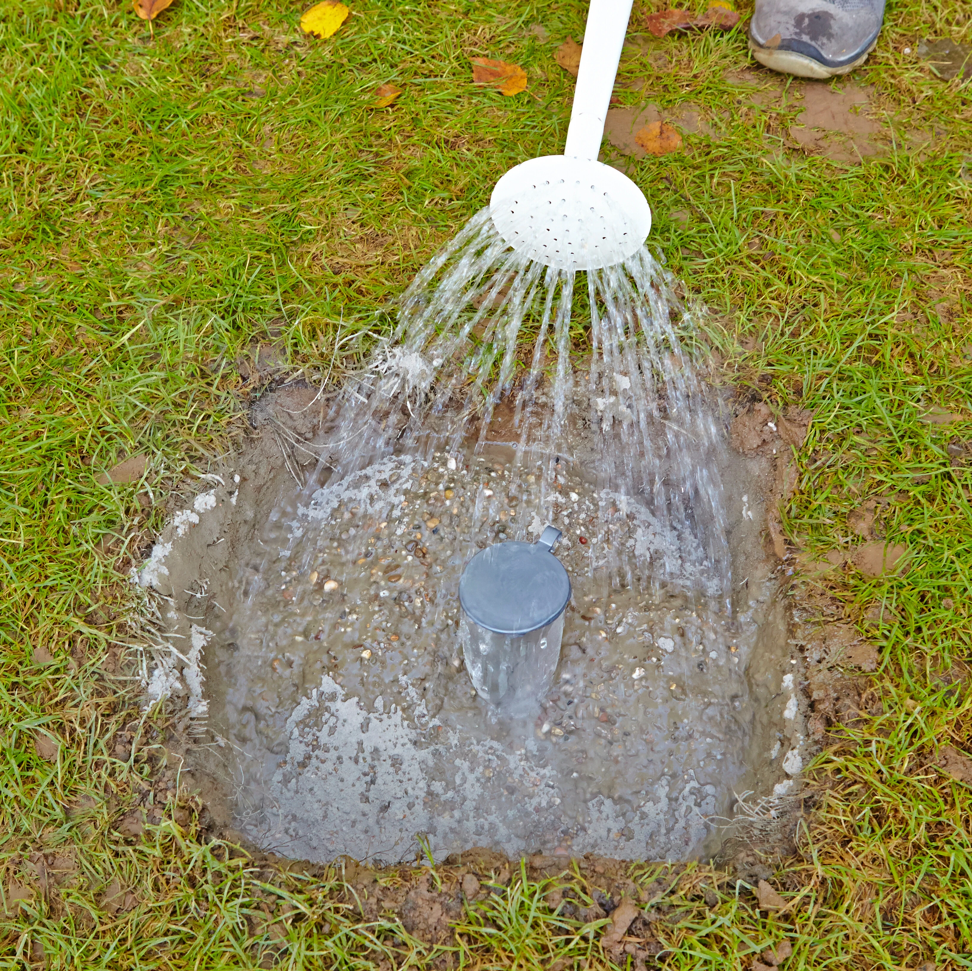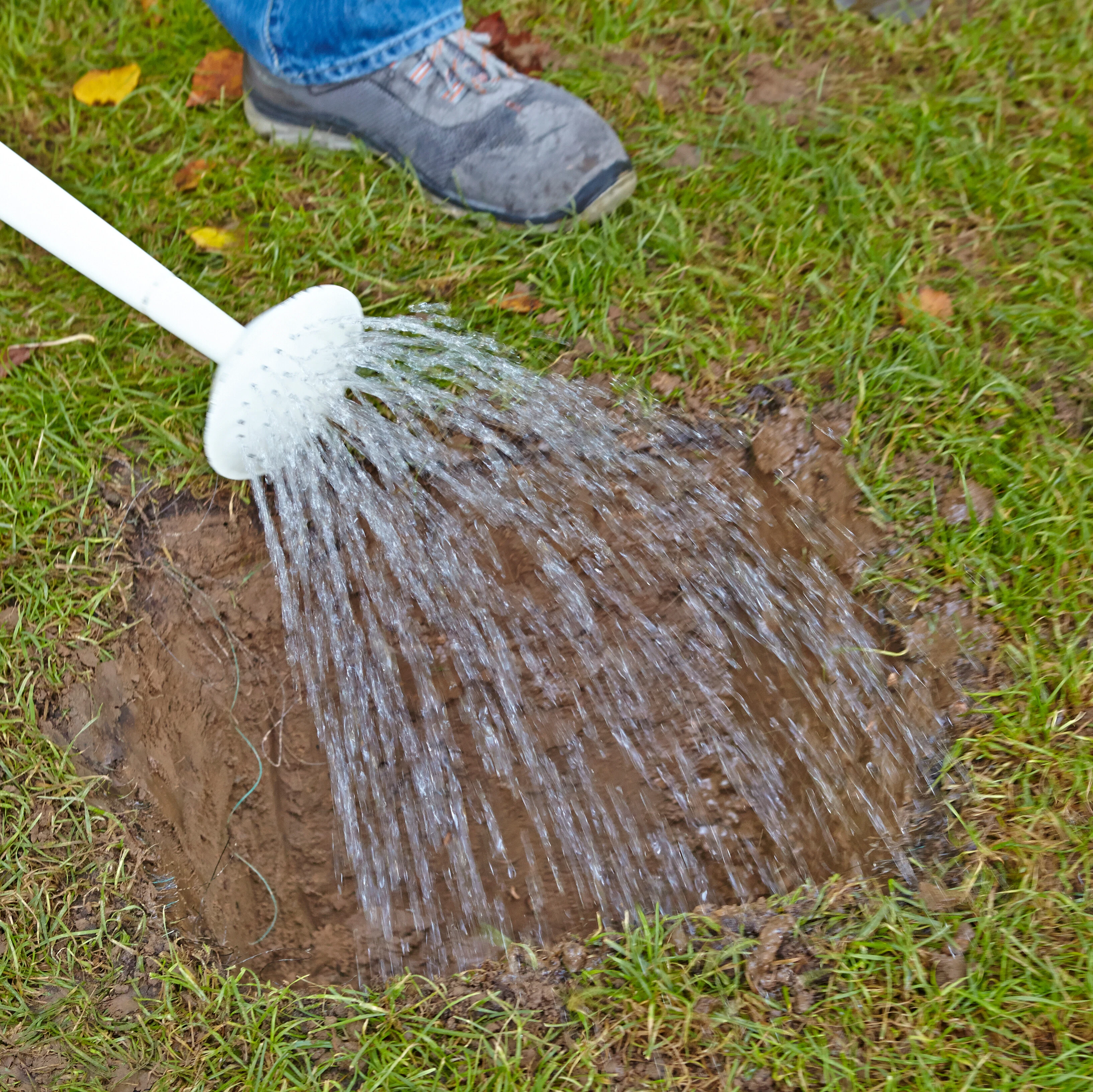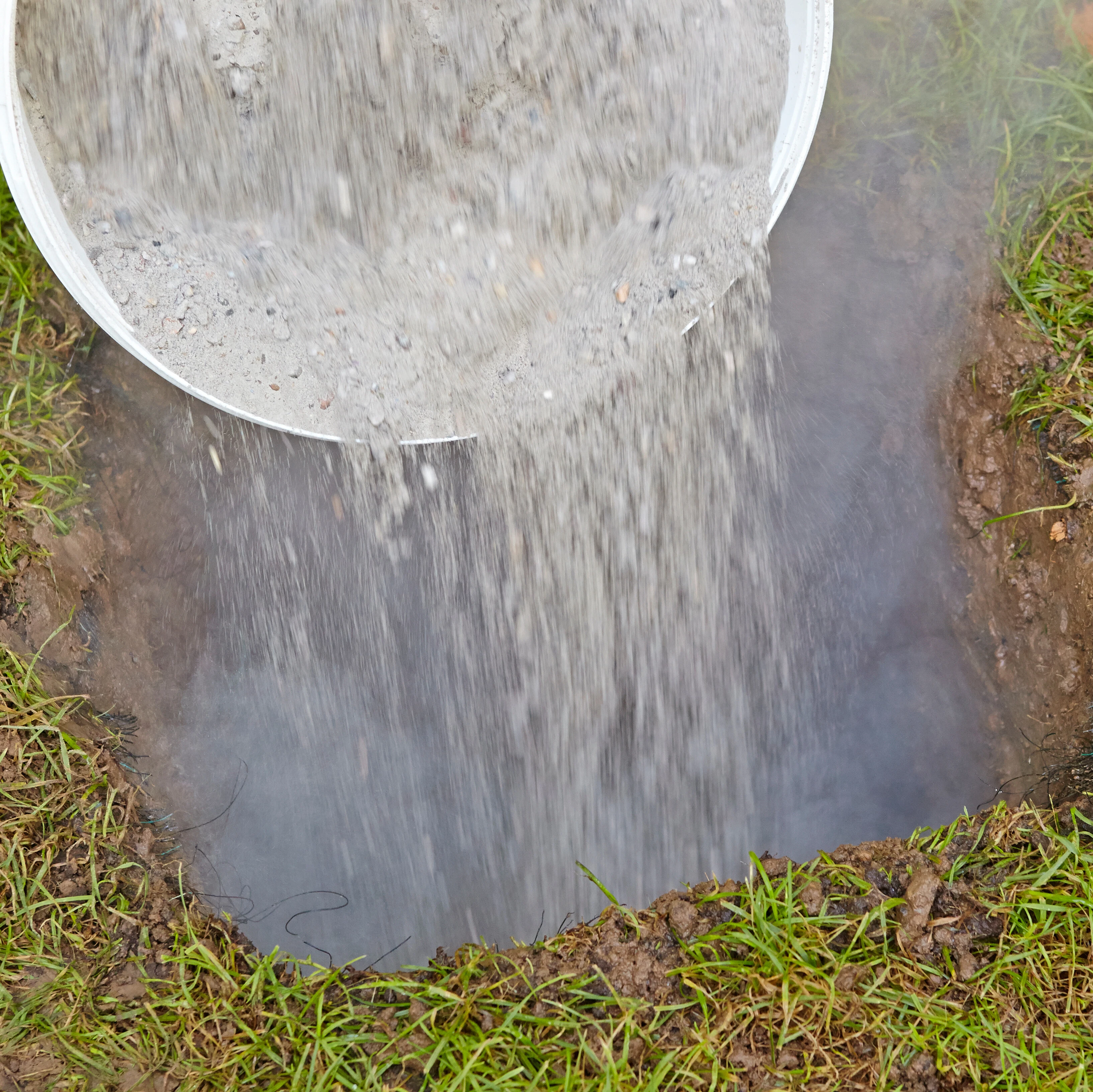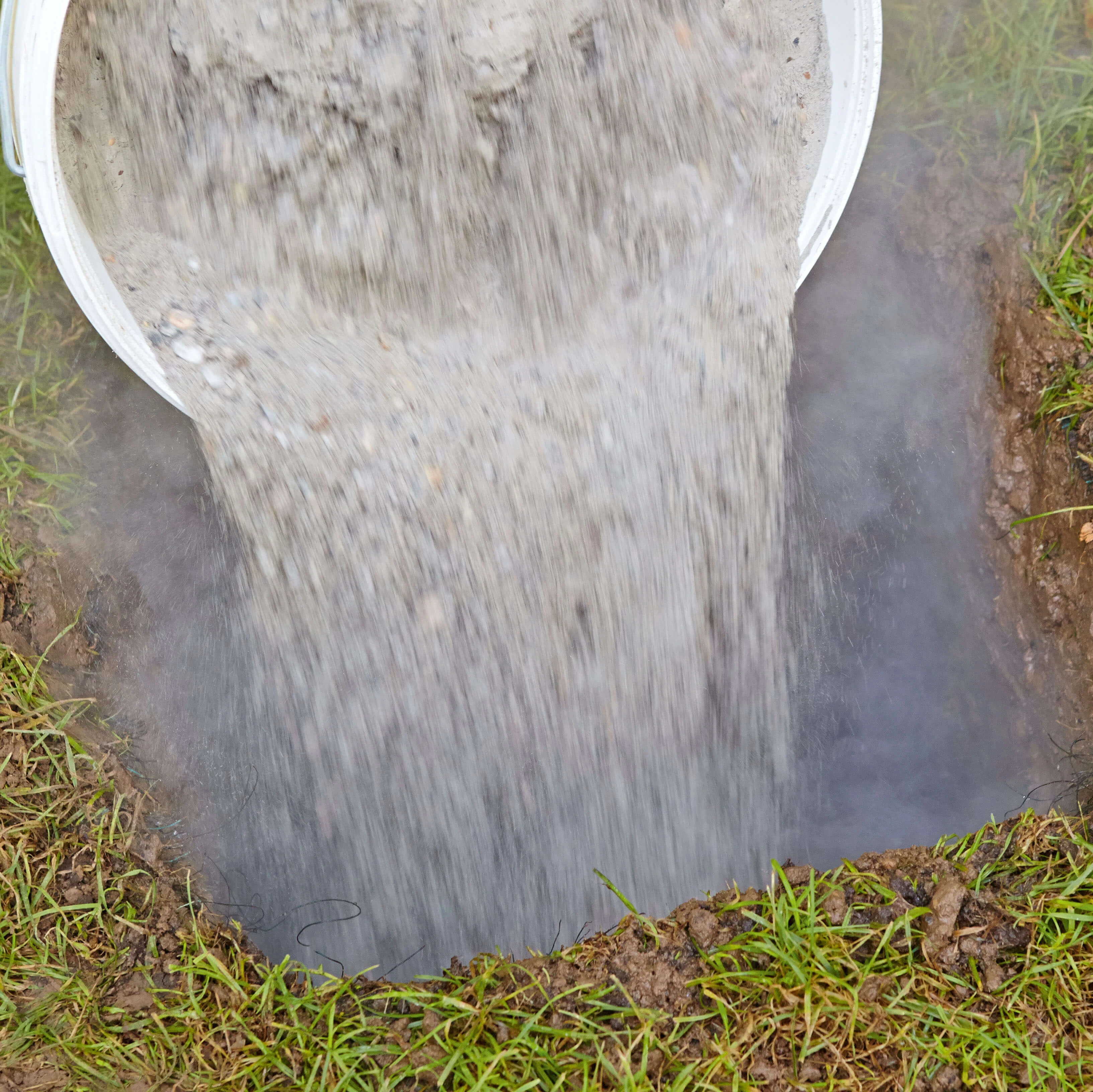 Hinweis: Die Menge der Wasserzugabe für einen 25-kg-Sack Ruck-Zuck Beton beträgt 3 bis 3,5 Liter. Bringen Sie den Ruck-Zuck Beton in Lagen von jeweils ca. 10 bis 15 cm ein und begießen Sie jede Lage vollständig mit Wasser aus einer Gießkanne.